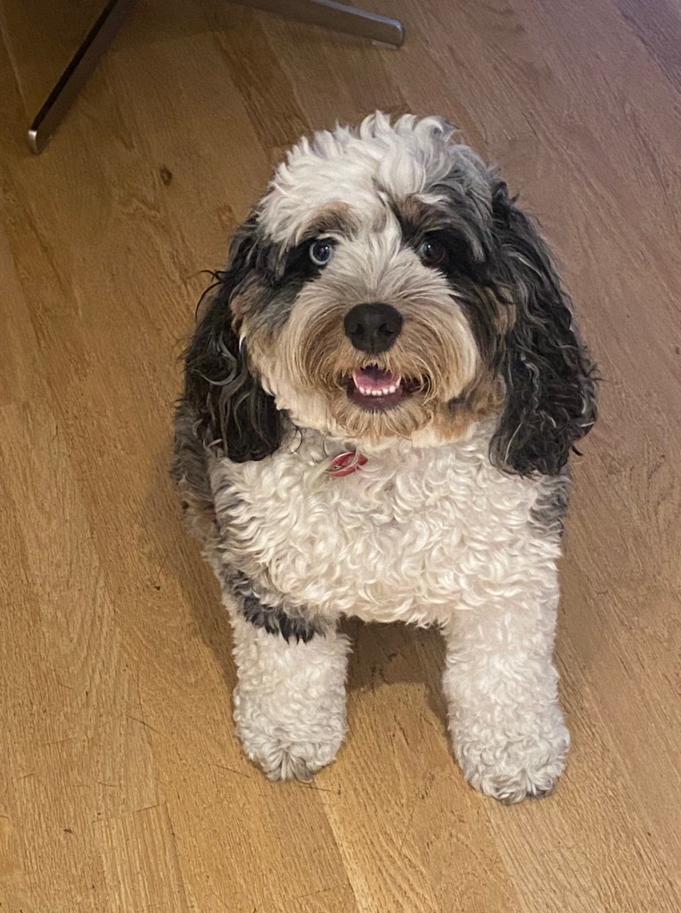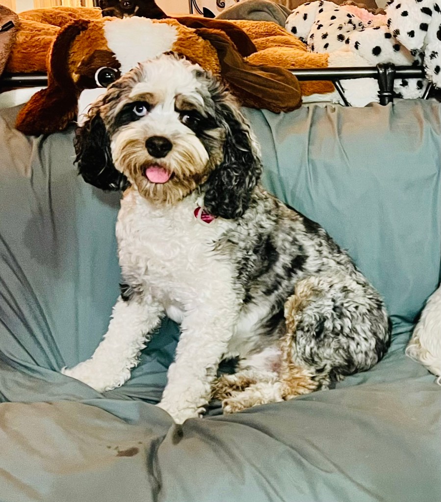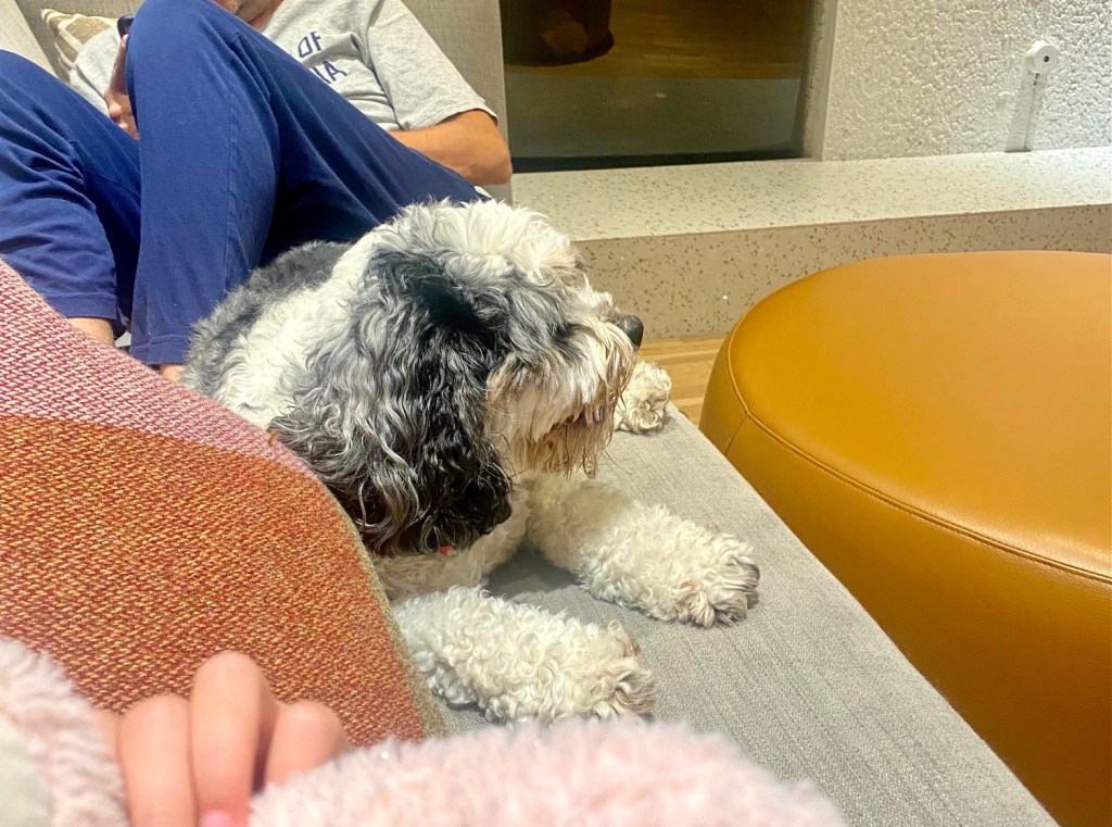 But I digress, I wanted to tell you about last night. I couldn’t believe it – I got to GO OUT. And not just out for a walk – I got to go OUT FOR DINNER with the big humans! For once, they left the small human home, and I was the one who got to go. We went to this place with a pretty river and rocks, and stores and restaurants. And SO MANY people who all paid attention to me. Now, we haven’t met yet so you don’t know this about me, but I can be quite charming. And I got to use all my charms last night. I smiled and wagged my tale while everyone said hi and scratched my ear. When they walked away, I found them again to say hi. I’m positive a few minutes spending time with me was the highlight of their night. Humans love me. They find me friendly. They think I’m sweet. They think I’m interesting. They always ask what breed I am. I don’t know what that means, but I’ve learned the answer is Cockapoo which is some sort of cocker spaniel, poodle combination. They also ask what color I am. The big humans say “Blue Merle” which apparently is unusual. And, humans always ooh and ahh at my eyes because one is blue and the other brown. I don’t understand what is so unusual about this but then again, I can’t see colors, so I just have to take their word for it.